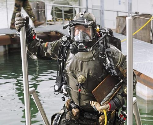 Ein angehender Unterwasserschweißer verlässt das Übungsbecken in Percha. © Jens Hartmann