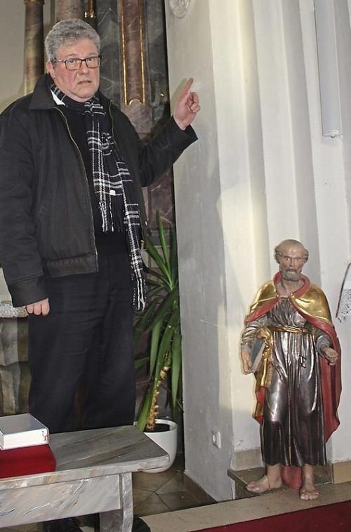 Pfarrer Georg Fetsch mit der Petrus-Figur. © jep