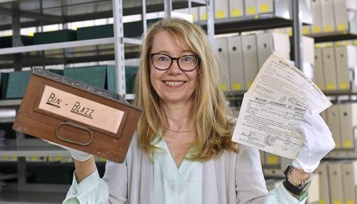 Ulrike Hofmann vom Stadtarchiv München zeigt die Behelfsausweise von Thomas Wimmer und Erni Singerl von 1945. Früher lagerten sie in so
