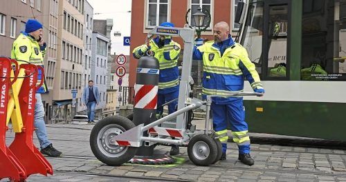 Arbeiter verschieben einen mobilen Poller, damit eine Trambahn durchfahren kann. © Malin Wunderlich/dpa