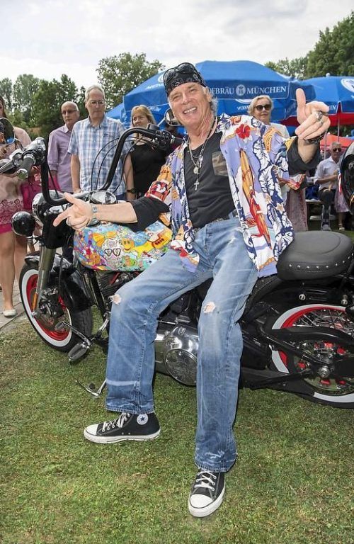 Motorradfan Wolfgang Fierek mit einer Harley Davidson bei einem Benefizfußballturnier in Ismaning