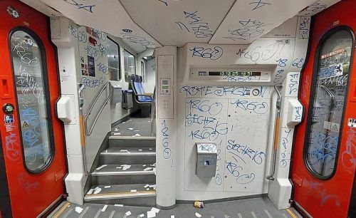 1860-Fans haben den RB 16 bei der Heimfahrt aus Ingolstadt von oben bis unten vollgeschmiert. Nicht das erste Mal, dass Löwen-Anhänger einen Zug verwüstet haben. © Fotos: Bundespolizei