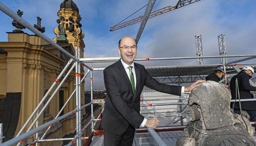 Ein Minister im Himmel: Albert Füracker am Dach der Feldherrnhalle am Odeonsplatz. Er freut sich darüber, dass das historisch wichtige Bauwerk s