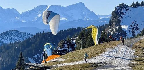 Abflug: Einige Winterwanderer fliegen am Brauneck, wo kaum Schnee liegt, mit Gleitschirmen zurück ins Tal. © M. Becker