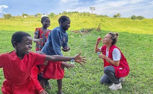 Anna Ertl aus Oberhaching mit Kindern in Uganda.