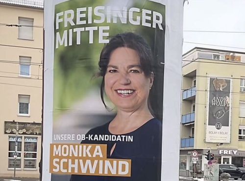 Ulm/Freising – Es ist ein skurriler Anblick: Monika Schwind, die Oberbürgermeister-Kandidatin der Freisinger Mitte in der Domstadt, prangt in Form eines riesigen Wahlplakates an einer Litfaßsäule in Ulm. Nu