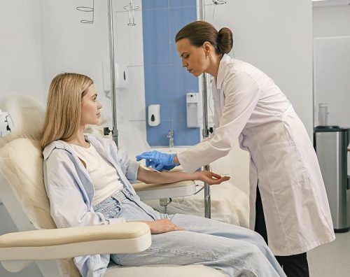 Eine junge Frau wird auf die Blutspende vorbereitet. © Astakhov/Getty