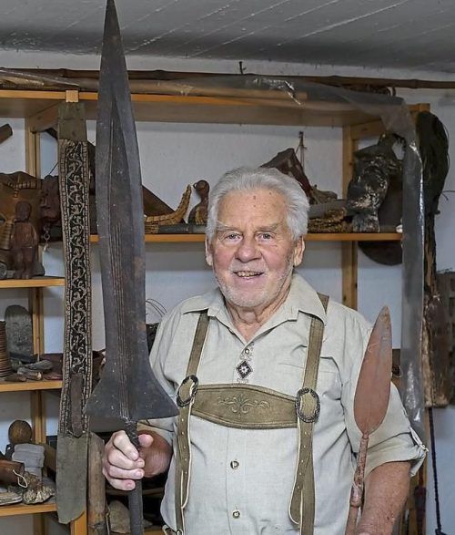 Schorsch Kirner in seinem Schatzlager. Hier hält er einen Fischer-Speer. © Stefan Rossmann