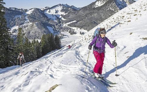 Skitourengeher beim Aufstieg zur Aiplspitz im Mangfallgebirge. © Brandl/picture alliance