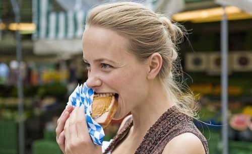 Brotzeit-Klassiker auf die Hand: Eine Frau beißt beherzt in eine Leberkas-Semmel. © Reiter/PA