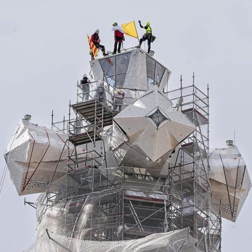 Die letzten Handgriffe: Arbeiter auf dem Kreuz.
