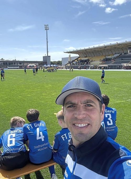 Der Weltmeister als Co-Trainer: Philipp Lahm mit seinen Jugendkickern von der FT Gern. © Privat