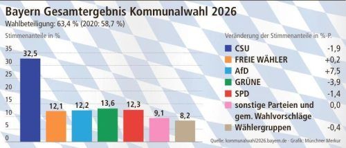 München – Die CSU hat bei den Kommunalwahlen landesweit Verluste hinnehmen müssen: Ihr Stimmenanteil in den Landkreisen und kreisfreien Städten ging im Vergleich zur Wahl 2020 von 34,5 auf nun 32,5 Prozent zurück, zeigt eine Berechnung des Statistischen Landesamts. Zweitstärkste Kraft sind weiterhin