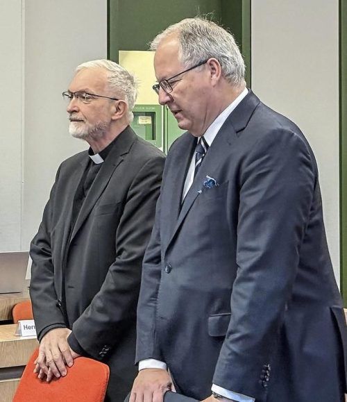 Früher Bischof, heute Pater: Gregor Maria Hanke (l.) mit Anwalt Thilo Profdte im Gerichtssaal. © Renzikowski/KNA