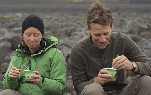 Brotzeit in Island: Zwei Wanderer löffeln Skyr. Inzwischen ist die Eiweiß-Bombe auch in Bayern gefragt – und Internet-Trends sorgen für Engpässe im Supermarkt. © Getty/Cavan Images