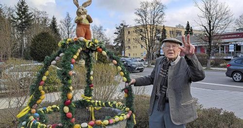 Emil Baumgärtner ist 106 Jahre alt – und er lässt es sich nicht nehmen, jedes Jahr den Osterbrunnen seines Seniorenheims in Ottobrunn (Kreis München) zu schmücken. Die Haustechnik hat ihm geholfen, das Gestänge auf den Brunnen zu bauen, damit er es mit bunten Eiern behängen konnte. Jeden Tag kontrol