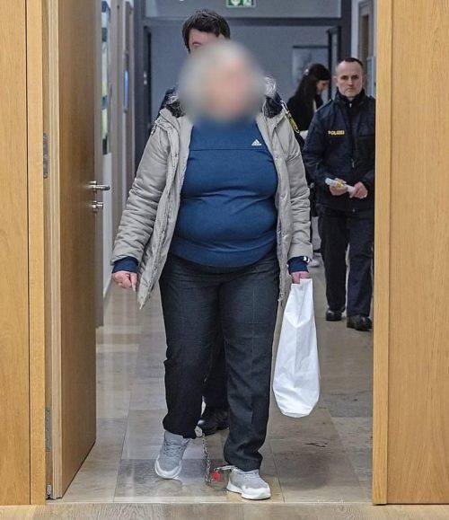 Die Angeklagte betritt mit Fußfesseln den Saal des Landgerichts Deggendorf. Sie soll ihren Partner vergiftet haben. © dpa