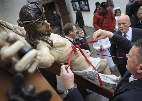 Die Atmosphäre ist andächtig, es ist still. Eine Stunde lang werden jahrhundertealte, überlebensgroße Figuren durch die Gassen in Lohr am Main getragen. Die Karfreitagsprozession in der unterfränkischen Stadt gilt mit Belegen aus der Mitte des 17. Jahrhunderts als eine der ältesten im deutschsprachi