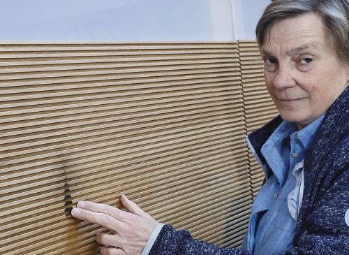 Stadtkirchen-Verwaltungsleiterin Elisabeth Maier zeigt auf einen Brandfleck. © Leh