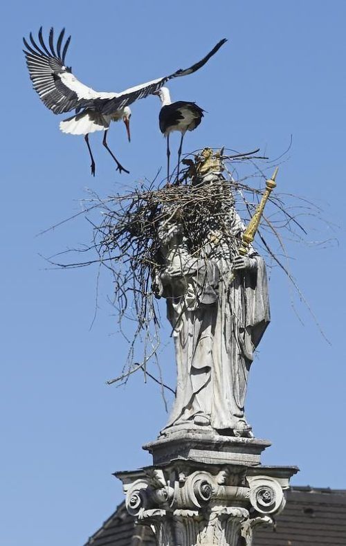 Die Mariensäule in Freising gefällt einem Storchenpaar so gut, dass es dort mit dem Nestbau begann. © Lehmann