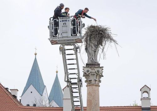 Auf ins neue Nest: Vor den Augen zahlreicher Schaulustiger hat eine Spezialfirma mithilfe der Feuerwehr gestern eine Nisthilfe auf dem Freisinger Marcushaus angebracht. Vor den Augen des in den vergangenen Tagen berühmt gewordenen Storchenpaares, das sich auf der gegenüberliegenden Mariensäule einge