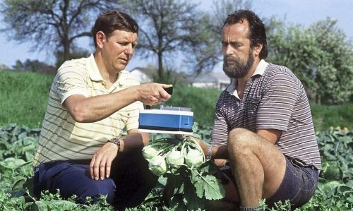 Mit dem Geigerzähler auf dem Gemüsefeld: Zwei Männer messen im Mai 1986 bei Allensbach am Bodensee ihren Kohlrabi. © Vetter/p