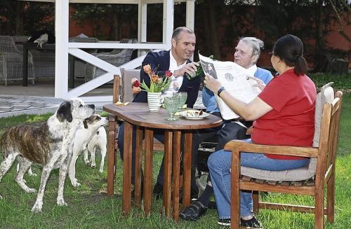 Michael Aufhauser (Mi.) mit seinem Nachfolger Dieter Ehrengruber und Pflegerin Chris in seinem Garten in Salzburg. © Privat (2)