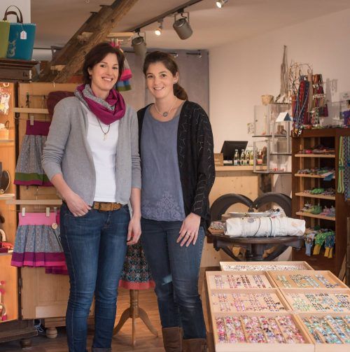 Im Dorfladen in Lenggries, Schützenstraße 4, verkaufen Hobby-Künstlerinnen aus dem Tölzer Land handgefertigte Produkte. So gibt es Trachtenschmuck aus Dirndlstoffen und Schultertücher von Fanny Mader (re.) sowie Trachten-Loopschals und Kindertrachtenröcke von Carolin Lijsen (li.), den Gründerinnen d