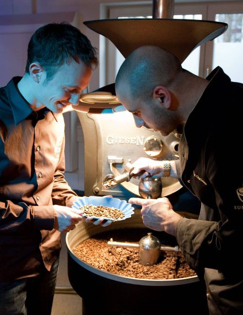 In der Supremo-Kaffeerösterei in Unterhaching liegt Kaffee in der Luft. Während man einen Cappuccino genießt, sieht man durch eine Scheibe in die Rösterei, wo das braune Gold (250 Gramm ab 5,80 Euro) aus 130 Ländern geröstet wird (links im Bild Juniorchef Raphael Braune). Der Familienbetrieb wurde v