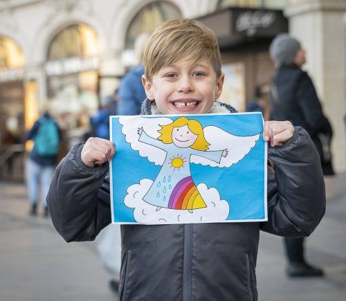 „Meine Oma hat das Christkind mal gesehen, hat sie mir gesagt! Es hat goldene Haare und wohnt hier in der Stadt. An Weihnachten zaubert es sich dann durch die Wand in die Häuser und bringt die Geschenke – für mich hoffentlich ein gelbes Kettcar!“