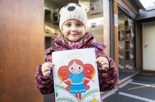 Ich weiß, wie das Christkind aussieht – es hat Flügel wie auf dem Bild! Es wohnt im Himmel und kann sehr gut fliegen. Wir gehen immer erst in die Kirche, danach darf ich dann zuhause die Geschenke aufmachen. Ich wünsch mir eine Puppe und einen Kuschelbär. Ich war auch ganz brav.