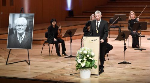München – Für Liselotte Vogel ist es ein schwerer Gang. Als letzte Rednerin betritt sie mit stützender Hilfe die schlichte Bühne, geht vorbei am überlebensgroßen Foto ihres geliebten Mannes ans Pult, vor dem ein weißer Topf mit weißen Rosen und weißen Orchideen steht. Erst a