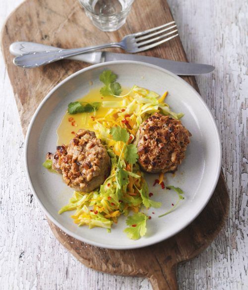 Schweinemedaillons mit Erdnusskruste und Spitzkohl-Kürbis-Salat