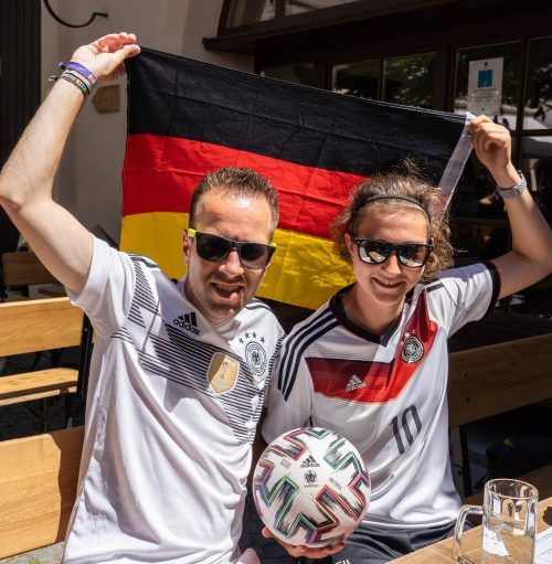 Anna-Lena Meiering, 21, und Tobias Streib, 34, aus Bocholt gehören zu den Glücklichen, die das erste Heimspiel der EM im Stadion mitverfolgen werden. Da für so ein Fußball-Event in München eher wenig los ist, fallen sie in ihrer Fußballausstattung ziemlich auf. Doch die Euphorie fehlt d
