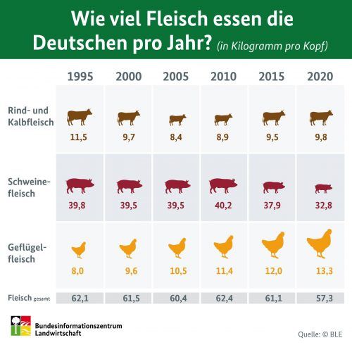 München – Entgegen dem weltweiten Trend geht der Fleischkonsum in Deutschland seit Jahren leicht zurück. Der Pro-Kopf-Verzehr war zuletzt so niedrig wie noch nie seit Beginn der Berechnung 1989. Dennoch: Deutsche essen überdurchschnittlich viel Fleisch – im Schnitt 57,3 Kilogramm jährlich. In weiten