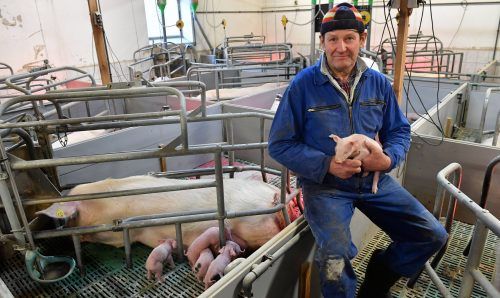 Theißing – In zwei Reihen stehen die Sauen, links und rechts vom Gang, eingepfercht im schwülen Stall. Dass sie dort so stehen, hat einen Grund: Sie warten auf Georg. In einer separaten Box grunzt der schwarz gefleckte haarige Eber vor sich hin. Er muss später im Gang hin und h