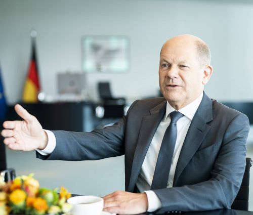 Er kommt fast direkt aus Kiew, hat zwei kurze Nächte im ratternden Zug in den Knochen, nur noch schnell geduscht. Und doch wirkt Olaf Scholz hochkonzentriert. Der Kanzler schaut die Fragesteller fest an, antwortet überlegt, druckreif, manchmal nach wenigen Sekunden Pause, nippt zwischendurch am Tee.