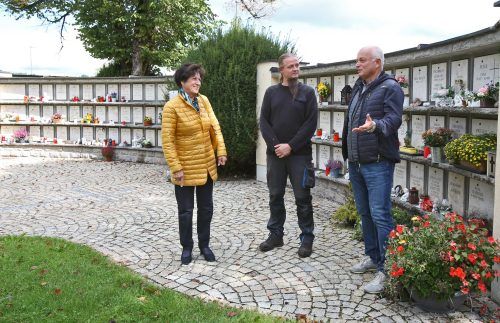 Bad Tölz – Herzförmig umarmt die Ligusterhecke die 100 Urnenplätze auf dem Waldfriedhof in Bad Tölz. An den Berührungspunkten der Herzbögen leuchten rote Eisbegonien in der Herbstsonne. In die Rasenfläche sind Steinplatten eingelassen. Bronzene Lettern verraten den Namen des Ver