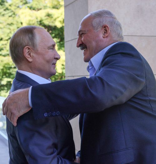 Dass Belarus’ und Russlands Machthaber eine enge Verbindung pflegen, wird bei gemeinsamen Treffen stets deutlich. Meist bleibt es nicht nur bei dem obligatorischen Handschlag zwischen Alexander Lukaschenko und Wladimir Putin, sondern es folgt eine innige Umarmung.