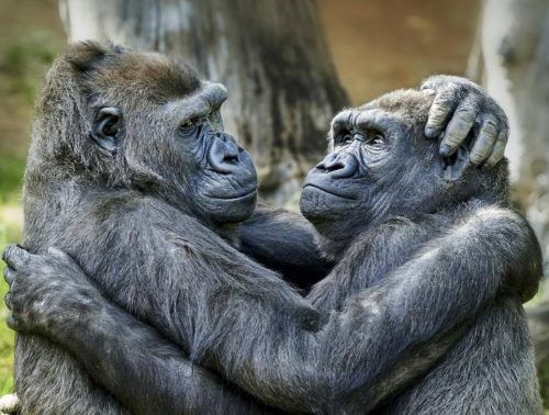 Freundlichkeit ist nicht nur dem Menschen gegeben. Der US-Amerikaner Stanley Bratawira hat sein Foto deshalb „Kindness is Universal“, Freundlichkeit ist universell, getauft. Es zeigt zwei Gorillas, die sich liebevoll umarmen – so wie ein altes Ehepaar. Ein Akt der Verbundenheit, Kommunikation und Li