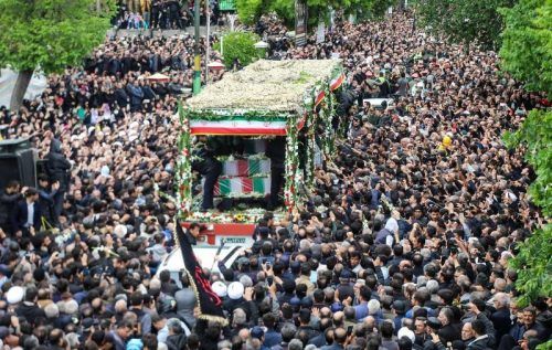 Ein Lastwagen mit den Särgen der Verunglückten fährt am Dienstag durch Täbris, gesäumt von tausenden Iranern. © Foto: ATA DADASHI/afp