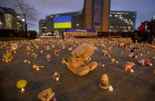 Jeder Teddy und jedes Spielzeug steht bei dieser Installation in Brüssel für ein nach Russland entführtes Kind. © AFP