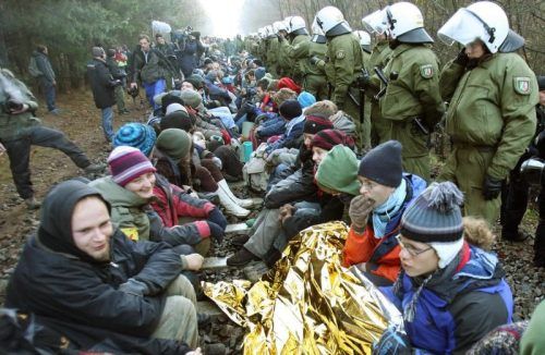 Atomkraftgegner besetzen 2005 die Castor-Transportstrecke, auf der Atommüllbehälter nach Gorleben rollen sollen. © pa