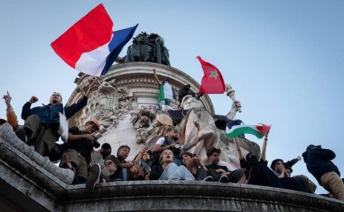 Eine Demonstration am Abend des zweiten Wahlgangs der Parlamentswahlen in Frankreich auf dem Platz der Republik in Paris. © Corinne Simon/kna