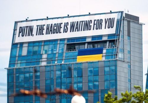 „Putin, Den Haag wartet auf dich“, steht auf einem riesigen Transparent an einem Hochhaus in Vilnius. © dpa