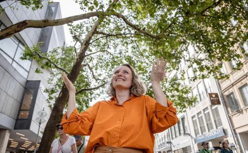 Amelie Bauer steht unter den einzigen großen und etwas Schatten spendenden Bäumen am Marienplatz. Die Hi