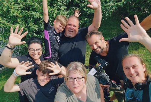 Sind jetzt Fernsehstars: Melanie und Michi Zeilinger (hinten) mit ihren Söhnen Liam (6) und Jason (11) und dem Kamerateam des TV-Senders Vox. Das Bild oben zeigt die Familie in Key West am Southernmost Point, dem südlichsten Punkt der kontinentalen Vereinigten Staaten von Amerika. © Flamingo Picture