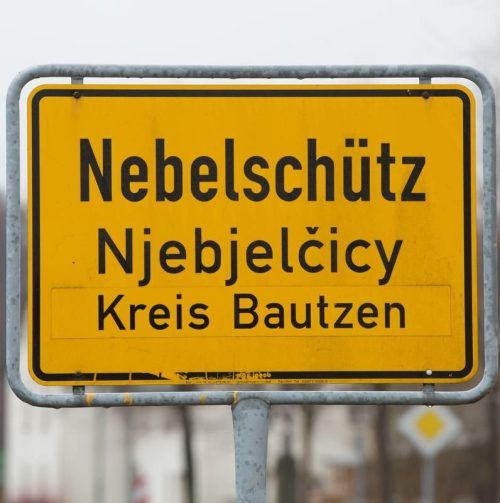 Ortstafel des sorbischen Dorfs Nebelschütz in Sachsen. © dpa