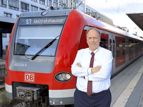 Helmut Binninger in seiner zweiten Heimat. Für den Fotografen simuliert er eine Ansage an die Fahrgäste. © Foto: Markus Götzfried