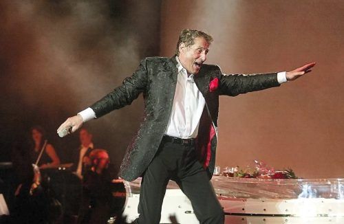 Juni 1987: Udo Jürgens bei der Meisterehrung des FC Bayern im Münchner Olympiastadion mit Trainer Udo Lattek. © Pa